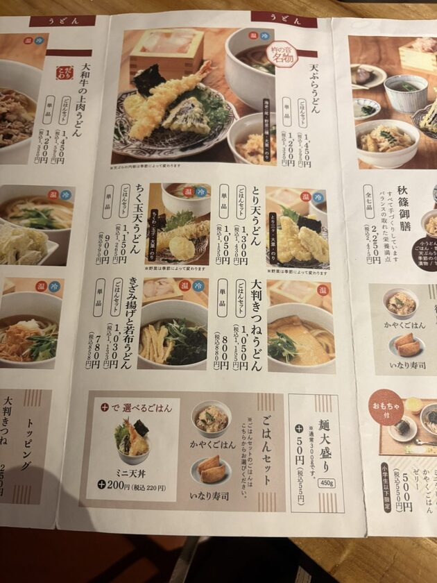 うどん単品の他にご飯などをセット出来ます。