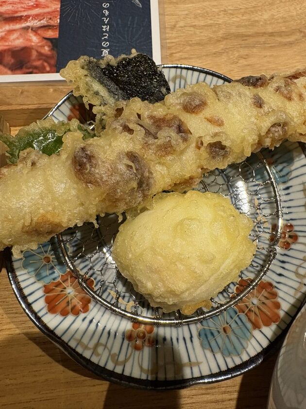 ちくわ、玉子、紫蘇、海苔の天ぷらが付いています。