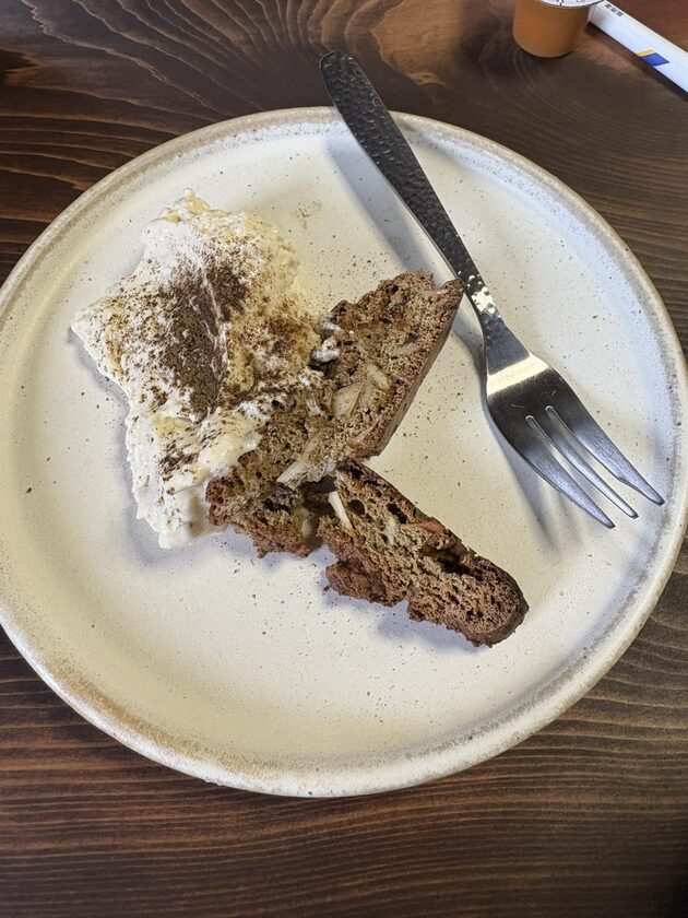 デザートはビスコッティ、ビスケットの固いやつに、クリームチーズのようなホイップっぽいソースです。